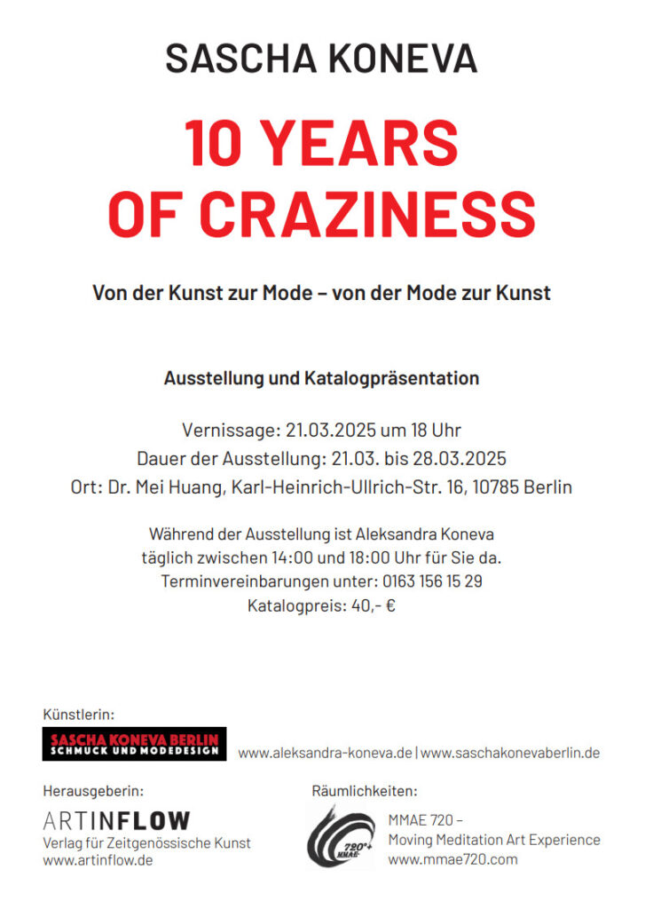 Diese Ausstellung widmete sich zehn Jahren künstlerischer Entwicklung von Sascha Koneva. Unter dem Titel „Zehn Jahre Wahnsinn“ wurden Arbeiten aus Mode, Installation und Fotografie präsentiert. Begleitend erschien eine gleichnamige Publikation, die einen vertieften Einblick in die Entwicklung der künstlerischen Sprache ermöglichte.